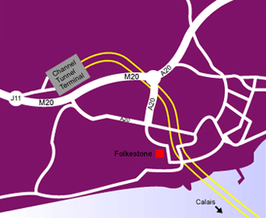 Folkestone Eurotunnel Terminal is approximately 65 miles from the South of London via Junction 11A of the M20 which connects to the M25 London orbital motorway.